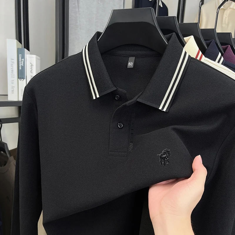 100Cotton Original Quality Men's Polo Shirt Soft Breathable Horse Print Long Sleeve Autumn Lapel T-Shirt Business Menswear Top